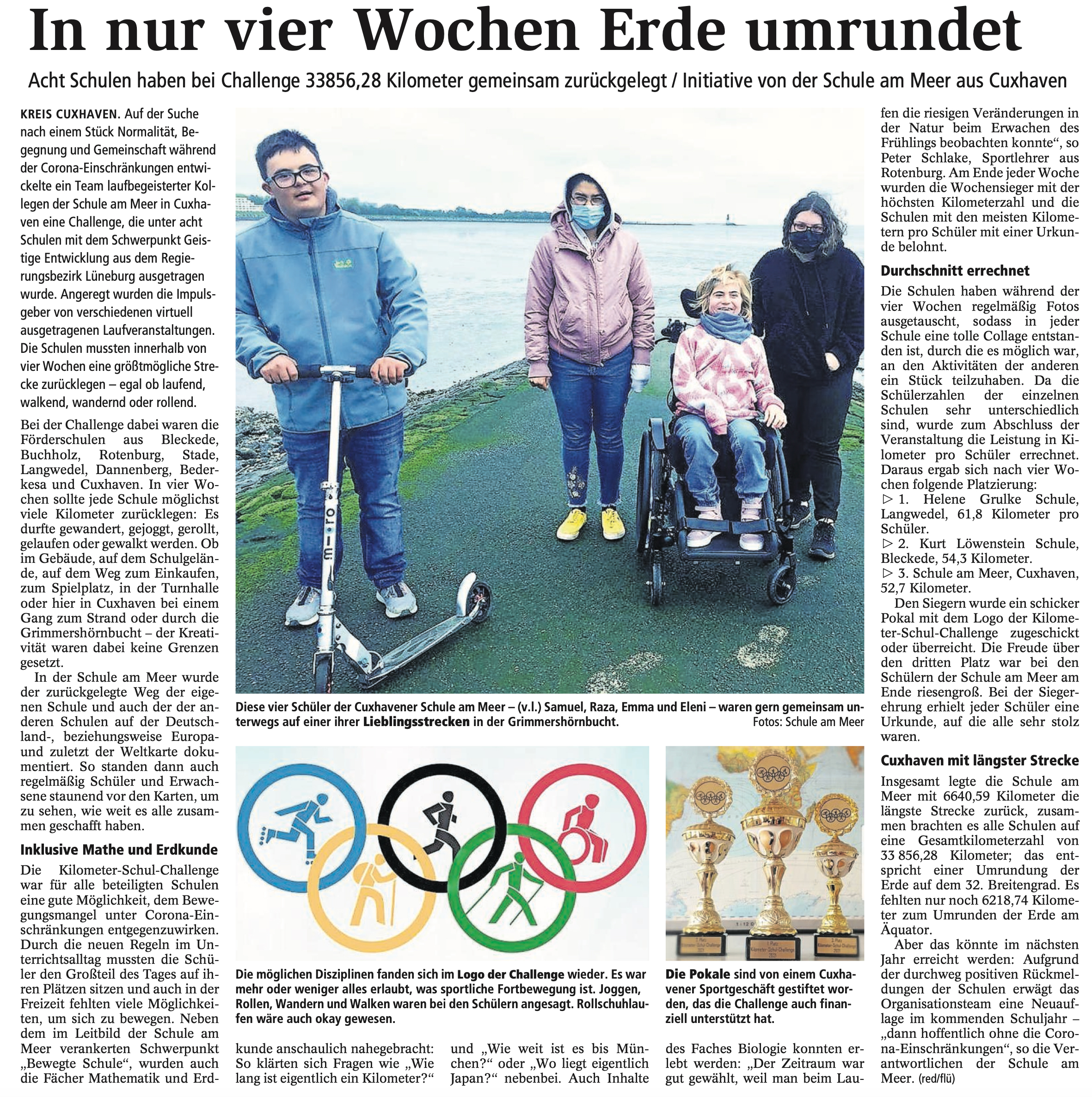 Da Corona unseren Alltag ganz schön durcheinander bringt, haben wir in der Schule am Meer versucht, dem etwas entgegenzusetzen und haben eine Lauf-Challenge ins Leben gerufen. Bei diesem Schulwettbewerb geht es darum, in vier Wochen möglichst viele Kilometer zu bewältigen. Jede/r wandert, läuft, rollt oder walkt bei sich vor Ort. Insgesamt haben 8 Schulen an diesem Wettbewerb teilgenommen, und wir sind stolz und glücklich, in der Disziplin "Strecke pro Teilnehmer*in" den 3. Platz und hinsichtlich der Gesamtstrecke sogar den 1. Platz belegt zu haben. Herzlichen Glückwunsch und vielen Dank an alle, die diesen Wettbewerb zu solch einer tollen Aktion gemacht haben!